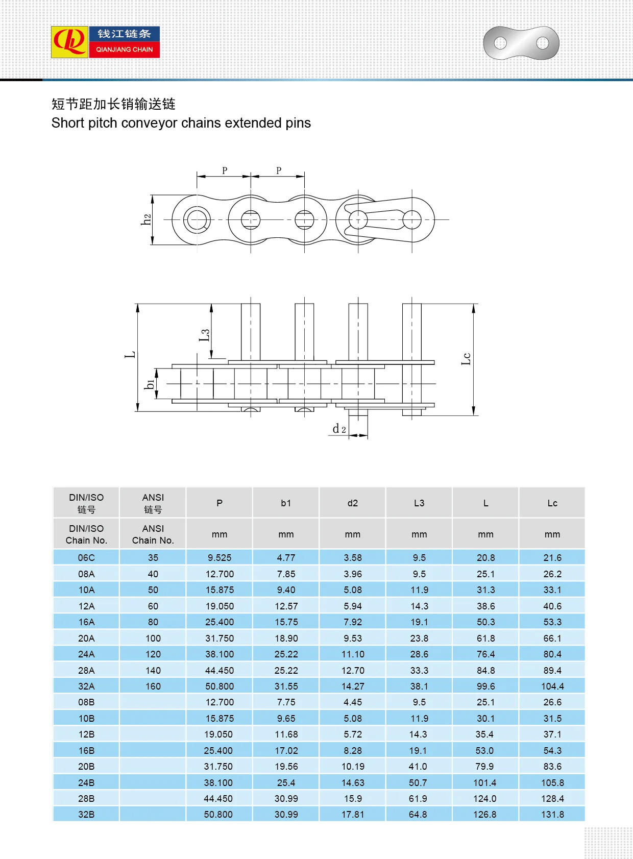 Rövid osztású szállítószalag láncok kiterjesztett csapok