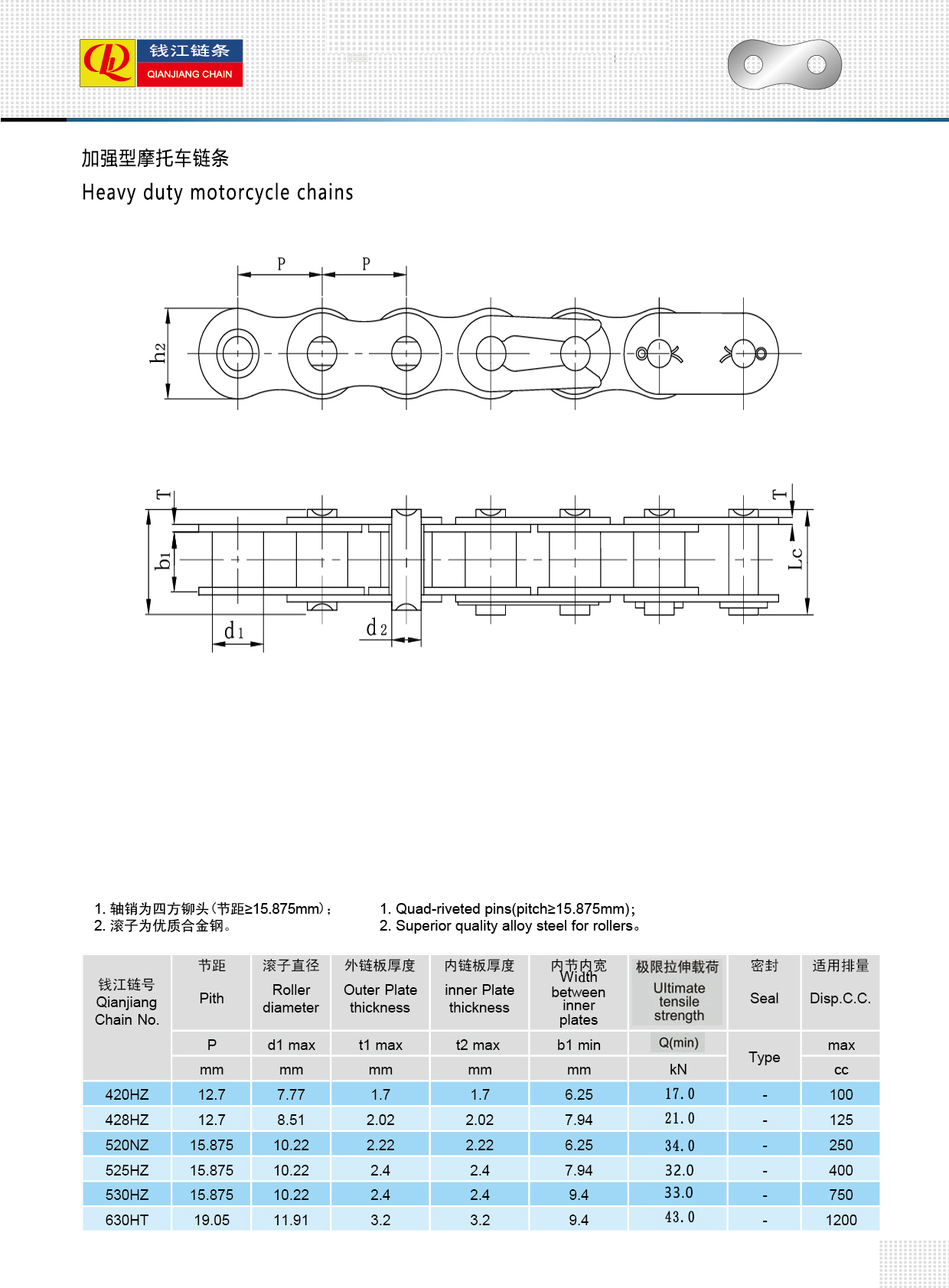 Nagy teherbírású motorkerékpárokhoz tervezték, teherbírást és egyenletes erőátvitelt biztosítanak, biztonságosabb és hatékonyabb vezetést biztosítva még az igényes körülmények között is. A robusztus szerkezet ellenáll a nyúlásnak és a korróziónak, csökkentve a karbantartási igényeket és meghosszabbítva az élettartamot.