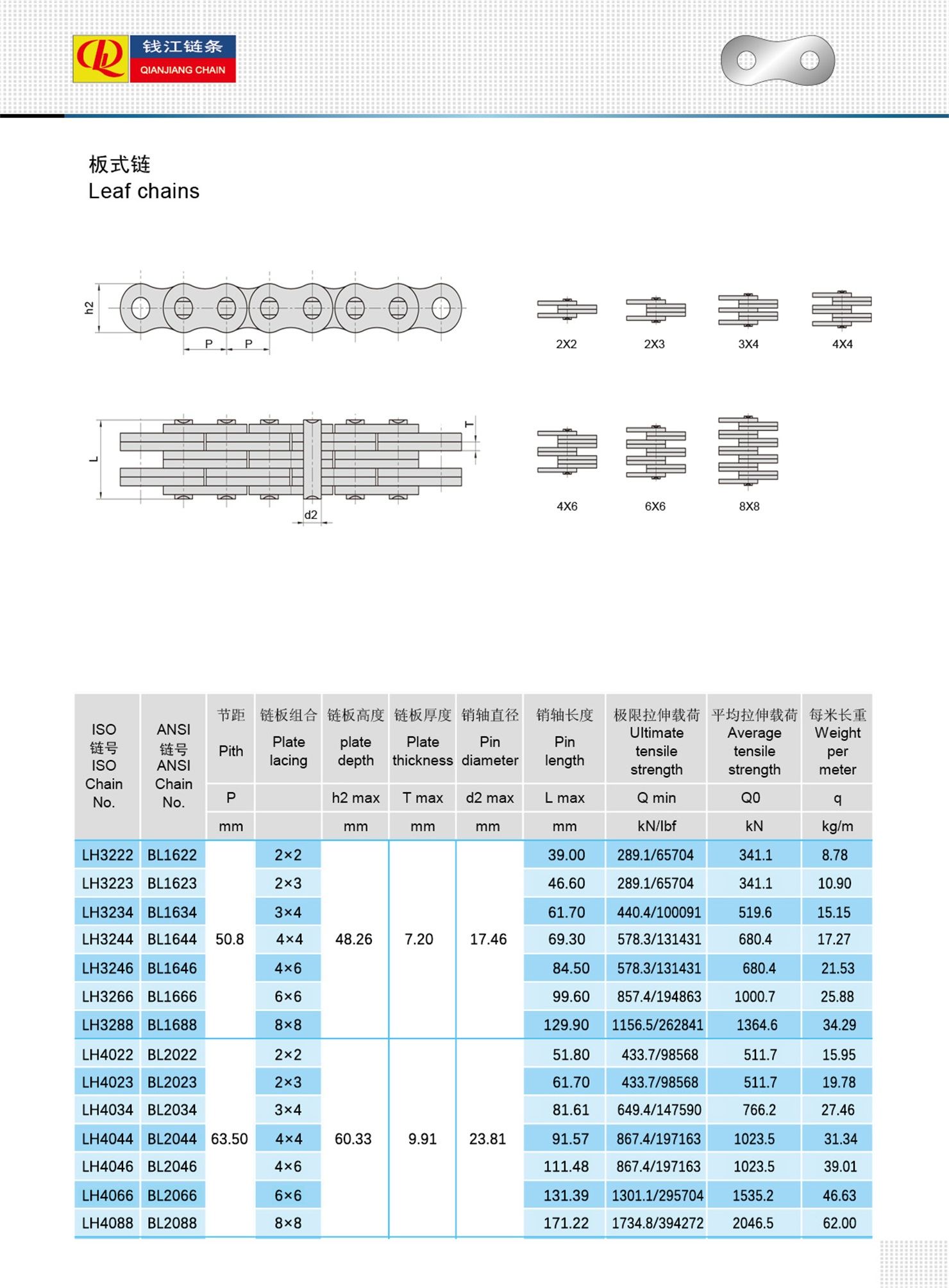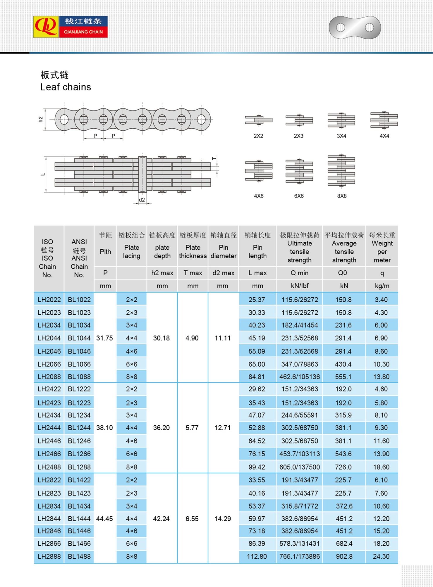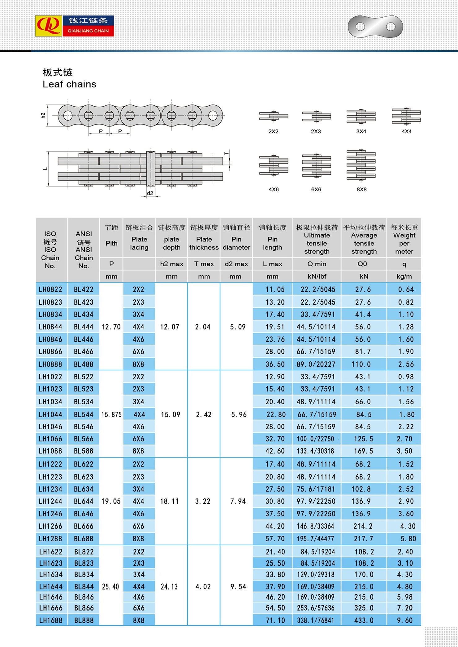 Az LH (BL sorozat) kopásálló és tartós Leaf Chain-eket nagy terhelésű, alacsony sebességű alkalmazásokhoz tervezték, így megbízható választást jelentenek az igényes ipari környezetben. Az átlapolt láncszemekkel és csapokkal kialakított láncok kivételes szakítószilárdságot és kopásállóságot kínálnak még zord körülmények között is. Kompakt kialakításuk zökkenőmentes működést tesz lehetővé szűk helyeken, míg a robusztus felépítésük minimális karbantartási igény mellett hosszú élettartamot biztosít.