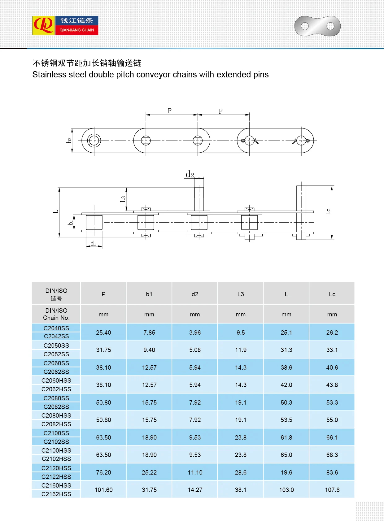 Rozsdamentes acél dupla osztású szállítóláncok meghosszabbított csapokkal